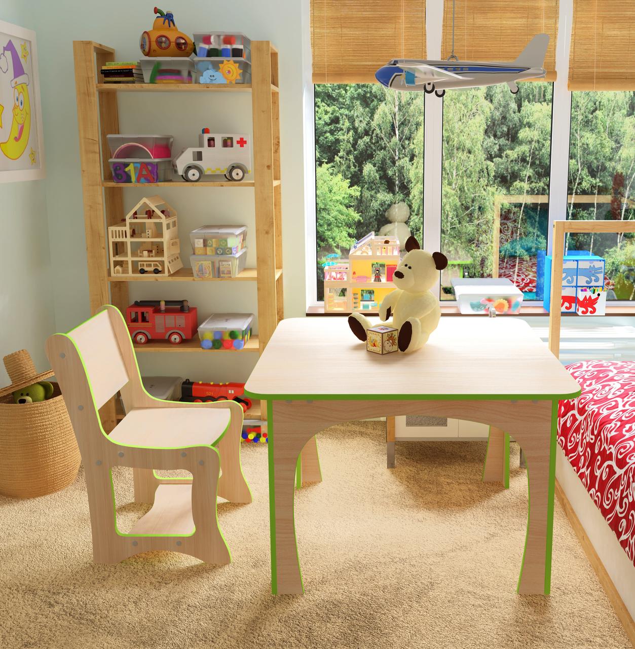 Комплект (стіл+стілець) дитячий Кроша New (зелена кромка) МАКСІ-Меблі, виготовляється з Ламінованої ДСП вищої категорії, товщиною 16 мм, міцної та екологічно безпечного матеріалу, що має клас емісії Е1 з дотриманням всіх санітарно-гігієнічних норм.